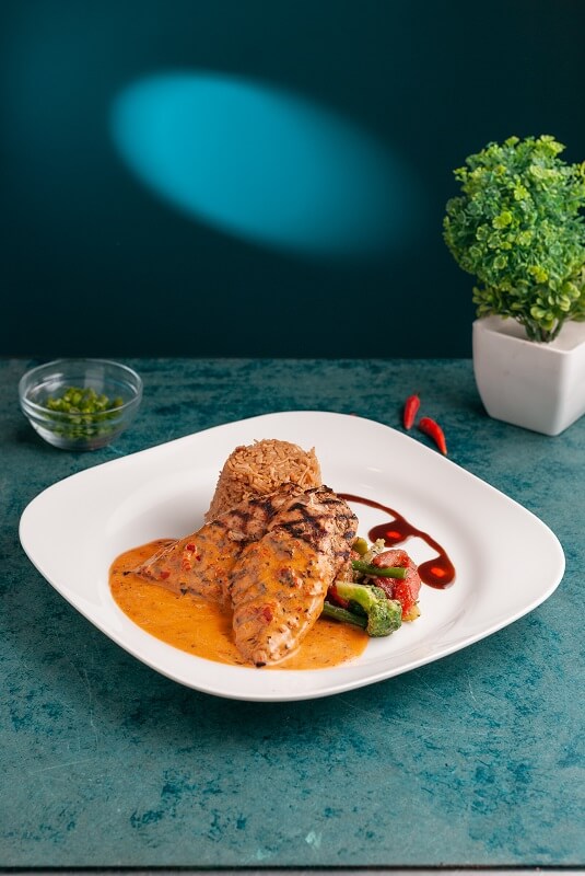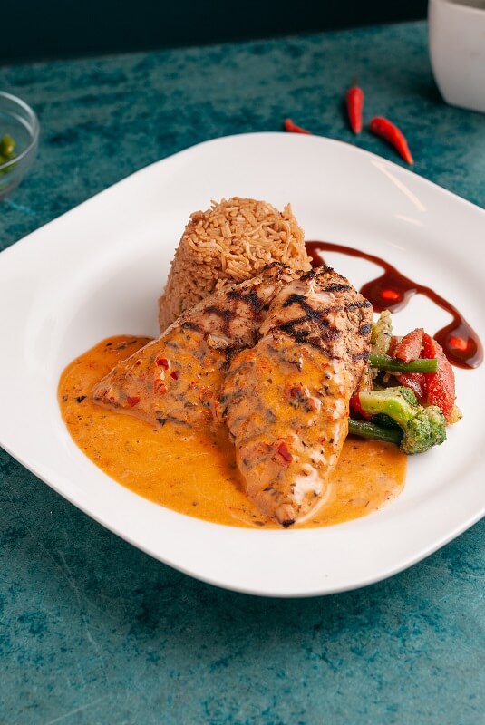 A juicy cut of beef, flame-grilled and encrusted in cracked Served with creamy spinach, mashed potatoes,
